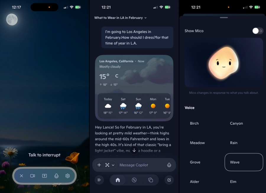 Trên ứng dụng Copilot dành cho máy tính để bàn và thiết bị di động hoặc trên trang web, bạn có thể tận hưởng cuộc trò chuyện bằng giọng nói với trí tuệ nhân tạo của Microsoft. Chạm vào biểu tượng micro ở cuối màn hình, và Copilot sẽ chào bạn bằng tên. Nói câu hỏi hoặc yêu cầu của bạn và chờ Copilot phản hồi. Sau đó, bạn có thể tiếp tục cuộc trò chuyện qua lại hoàn toàn bằng giọng nói. Khi hoàn tất, chạm vào dấu X để quay lại màn hình chính, nơi hiển thị bản ghi lại cuộc trò chuyện của bạn. Để thay đổi giọng nói, chọn biểu tượng Cài đặt trên thanh công cụ giọng nói và chọn giọng nói bạn muốn thử.