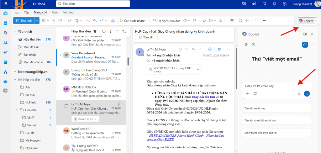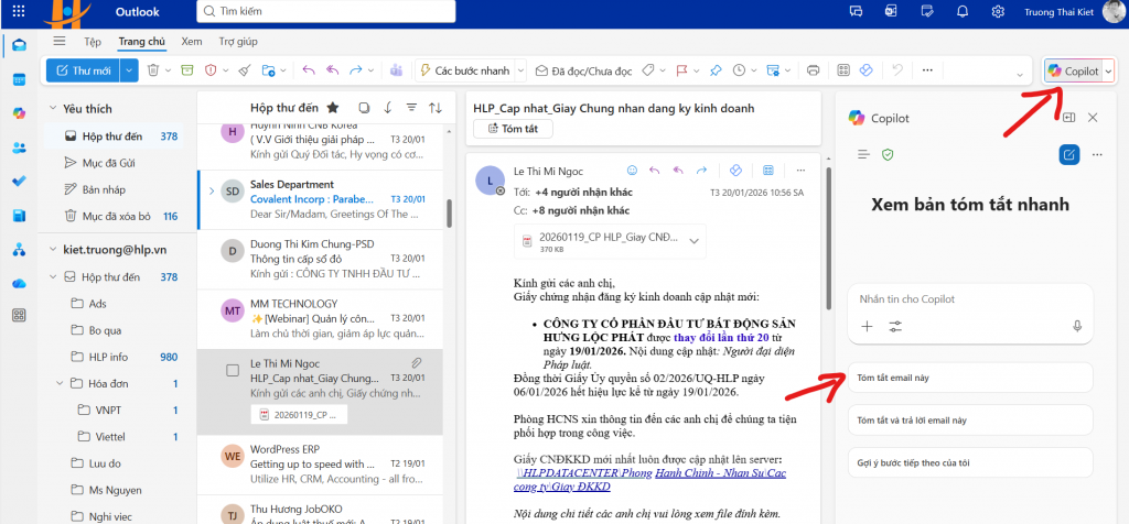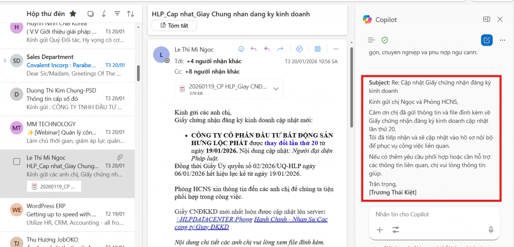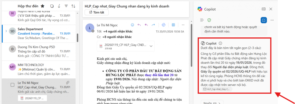 Thay vì phải lội ngược dòng đọc một chuỗi email dài lê thê (email thread) qua lại giữa nhiều người, Copilot sẽ: