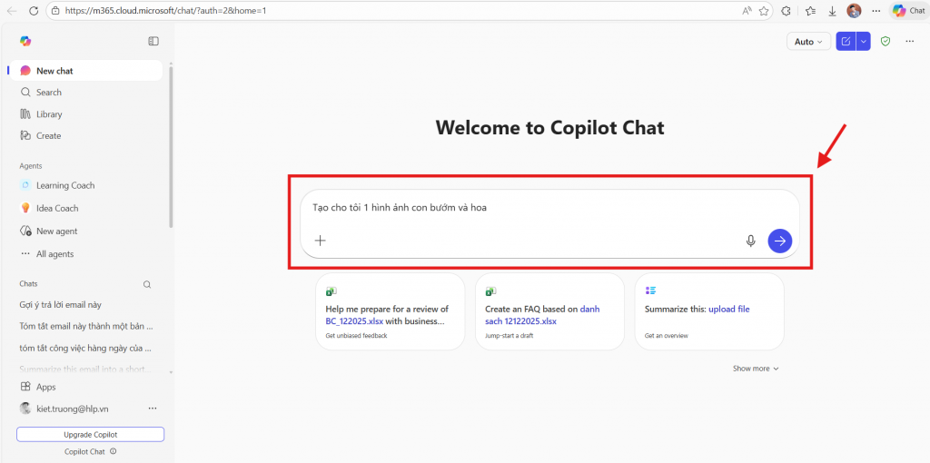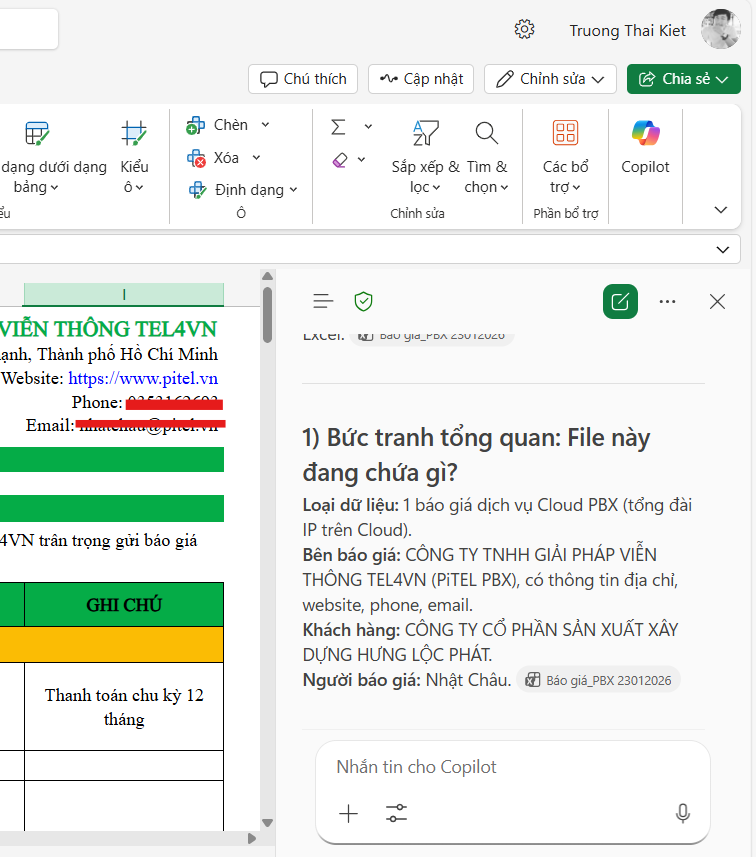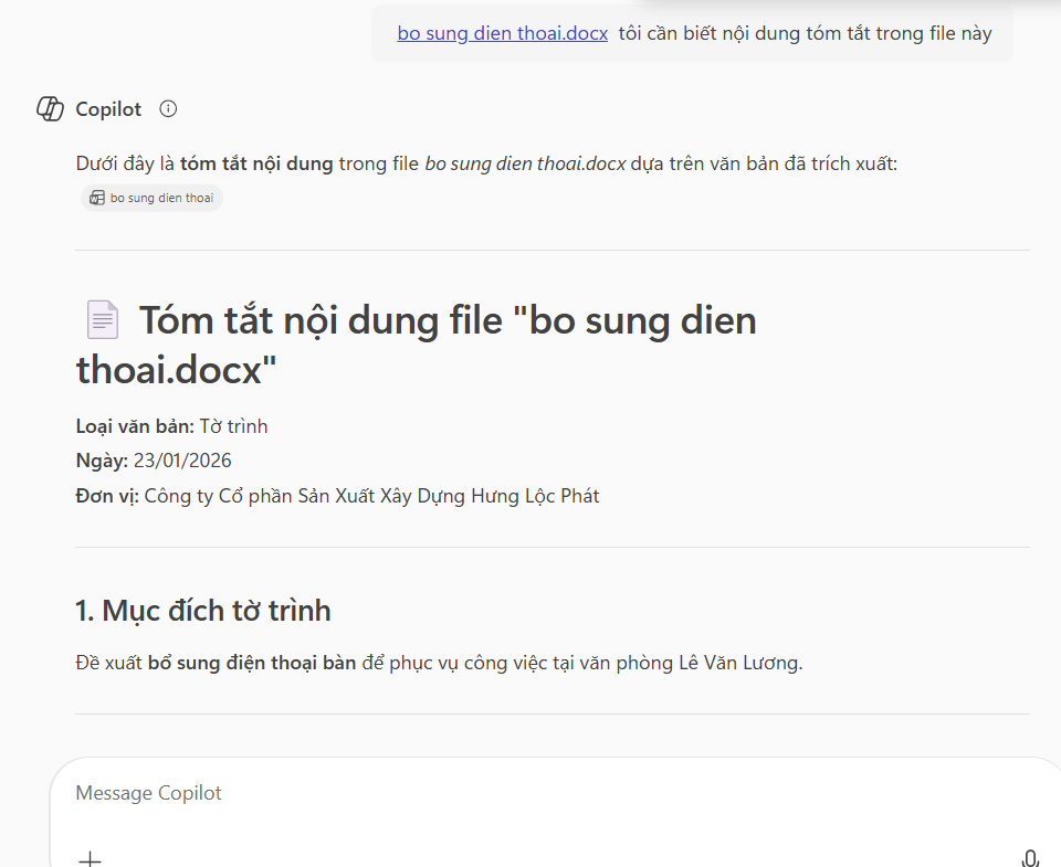 Kết quả thực hiện sẽ cho ta thấy Copilot tích hợp trực tiếp đã trả lời ngày, không cần tải tài liệu lên các công cụ AI khác. Hoàn toàn có thể sử dụng tại https://copilot.microsoft.com/ với tài khoản email công ty.