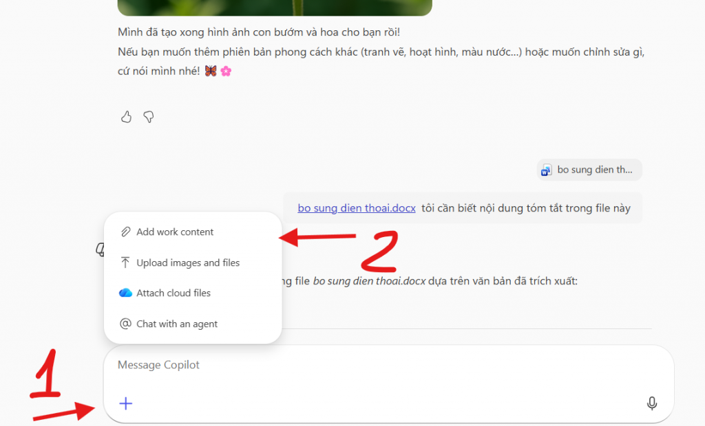 - Tải file: Nhấn vào biểu tượng cái ghim (hoặc dấu +) ở khung chat > Chọn “Upload from this device” > Chọn file tài liệu (Word, PDF, Text).