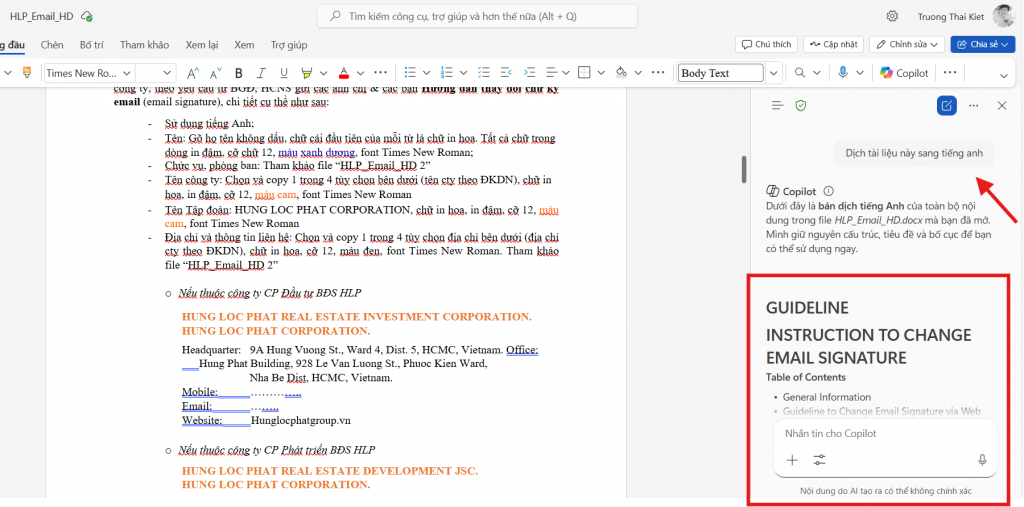 Cách này giúp Copilot đọc hiểu toàn bộ ngữ cảnh của tài liệu để dịch chuẩn hơn.