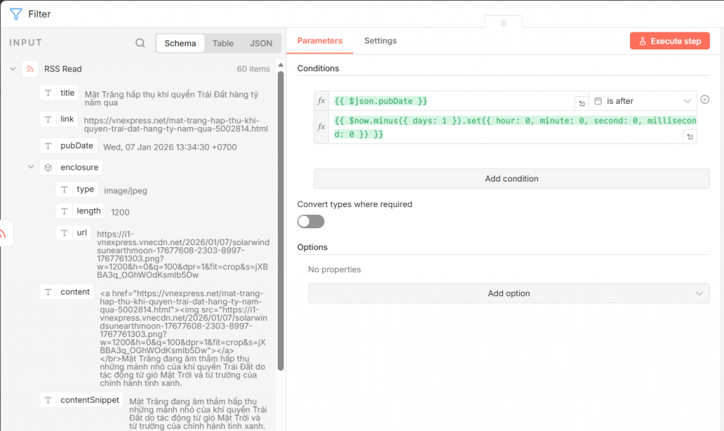 - Cách chuyên nghiệp: Sử dụng node Compare hoặc lưu ID/URL của bài báo vào một cơ sở dữ liệu nhỏ (như Google Sheets hoặc Static Data của n8n) để kiểm tra xem bài này đã được gửi chưa.