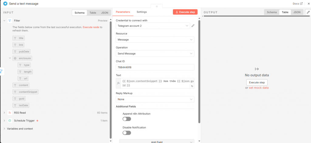 - Text: Bạn có thể định dạng nội dung như sau:[VnExpress] {{ $node[“RSS Read”].json[“title”] }}Tóm tắt: {{ $node[“RSS Read”].json[“contentSnippet”] }}Xem chi tiết: {{ $node[“RSS Read”].json[“link”] }}